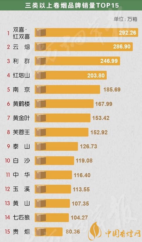 三類(lèi)以上卷煙品牌銷(xiāo)量中,百年香煙品牌雙喜紅雙喜以微弱的優(yōu)勢(shì)位居榜首,云煙緊隨其后與排名第三的利群拉開(kāi)差距。紅塔山、南京、黃鶴樓、黃金葉、芙蓉王分別位居4-8位,銷(xiāo)量也維持在一百五十萬(wàn)箱以上,泰山、白沙、中華、玉溪、黃山、七匹狼、貴煙雖然銷(xiāo)量在一百五十萬(wàn)箱以下,但都榜上有名,分別占據(jù)9-15位。一直以來(lái),三類(lèi)卷煙作為全國(guó)卷煙市場(chǎng)的中堅(jiān)力量,其市場(chǎng)份額之高、覆蓋面之廣、影響力之深,始終備受行業(yè)內(nèi)外的關(guān)注。