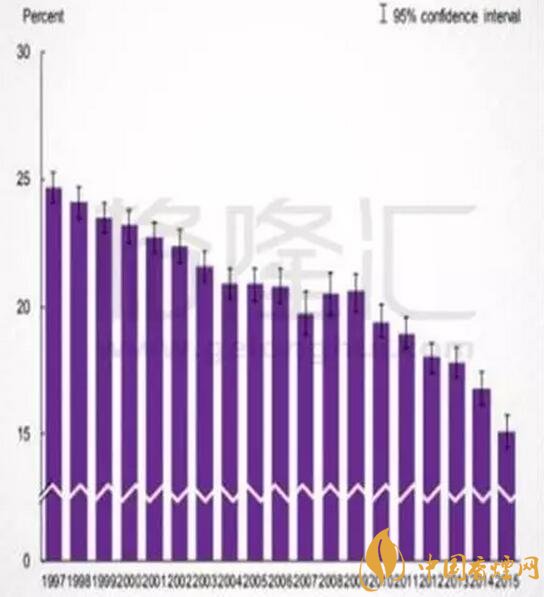 1997—2015年美國成人的吸煙率走勢圖