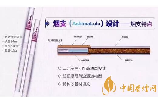 煙支Ashima Lulu,為纖細(xì)型,長84mm,直徑5.4mm,重量只有0.5克。具有二元空腔匹配高透風(fēng)設(shè)計(jì)、超低阻氣流通道構(gòu)型、特種芯基材填充等特點(diǎn)。