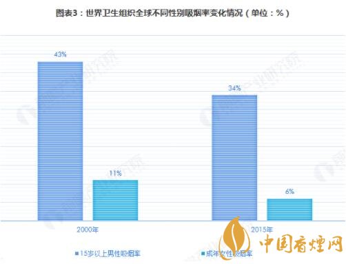 世界衛(wèi)生組織的報(bào)告指出,2000年以來全球男性和女性的吸煙率均有所降低,但吸煙人數(shù)仍在增長(zhǎng)。具體來看,全球15歲以上的男性吸煙率從2000年的43%下滑到34%,而女性吸煙率則從2000年的11%下滑到6%。從吸煙人數(shù)的規(guī)模來看,目前全球共有11億成年煙民以及至少3.67億無煙煙草吸食者。此外,全球還有大約2400多萬名13歲-15歲的青少年吸食煙草,另有1300多萬名青少年使用無煙煙草制品。