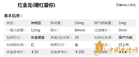 紅金龍(愛你)硬藍(lán)煙身長(zhǎng)90mm,焦油含量?jī)H為8mg/支,煙支修長(zhǎng)雅致、煙氣淡雅醇厚、口感醇和細(xì)膩。帶給品吸者新鮮有趣的吸食體驗(yàn)和適中的滿足感。吸食口感上,和南京炫赫門比較相似,低焦、低危害對(duì)身體危害也要低一些。只不過目前部分地區(qū)已經(jīng)買不到該款煙了,消費(fèi)者要注意甄別真假,以免上當(dāng)受騙。