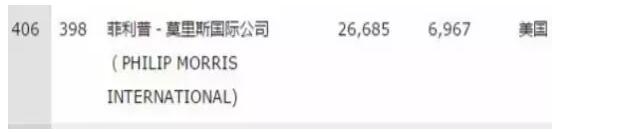 翻遍整個(gè)榜單,終于在末尾出發(fā)現(xiàn)了榜單唯一一家煙草公司--菲利普•莫里斯國(guó)際公司(簡(jiǎn)稱菲莫國(guó)際,萬(wàn)寶路就是它家生產(chǎn)的),以營(yíng)收266.85億美元、利潤(rùn)69.67億美元排名世界500強(qiáng)第406位。