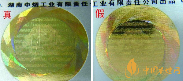②迎光觀察激光全息圖案:真品卷煙圖案內(nèi)拼音字母、芙蓉花及“芙蓉王”轉(zhuǎn)換不同角度,都會呈現(xiàn)不同圖案的切換,且層次清晰、字體完整;假冒卷煙無論如何轉(zhuǎn)換角度,都無法達(dá)到完美切換,字體模糊,圖案缺失嚴(yán)重。