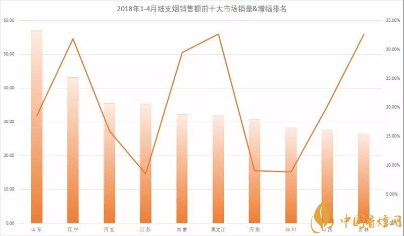 今年前4個(gè)月,東三省——包括大連——再加上山東,5省(市)合計(jì)實(shí)現(xiàn)細(xì)支煙銷售42.1萬箱,占全國比重達(dá)到18.1%,整個(gè)東北地區(qū)細(xì)支煙的市場份額已經(jīng)達(dá)到23.4%,最高的大連達(dá)到26.6%,不僅做到了四分天下有其一,而且在高位運(yùn)行的基礎(chǔ)上,仍然保證了至少30%以上——最低的黑龍江31.4%、最高的大連58.6%——的同比增幅。