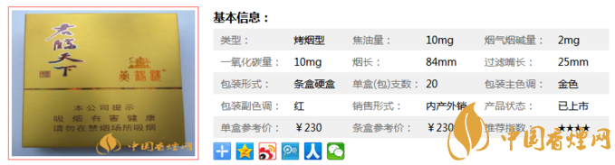 黃鶴樓君臨天下2300元/條,230元/包。香氣均勻和諧,外觀精致,因為價格較高,此前一再被網(wǎng)友拿來炒作,以致于現(xiàn)在在國內(nèi)都很少有這款煙流通,外銷占比較大。黃鶴樓品種較多,口感方面也是因人而異,具體細節(jié)還是看個人習慣。