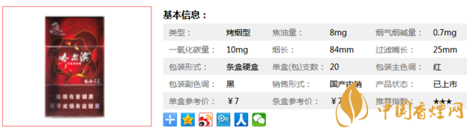 | 類型 :烤煙型 | 焦油量 :8mg | 煙氣煙堿量 :0.7mg | 一氧化碳量 :10mg |