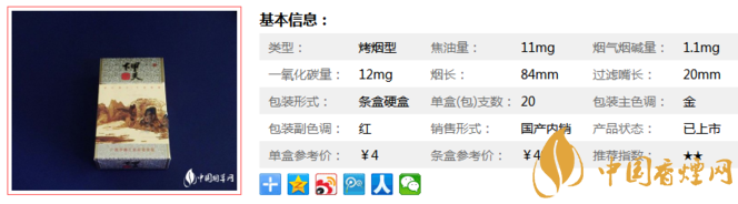 | 類型 :烤煙型 | 焦油量 :11mg | 煙氣煙堿量 :1.1mg | 一氧化碳量 :12mg |