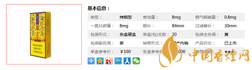| 類型 :烤煙型 | 焦油量 :8mg | 煙氣煙堿量 :0.8mg | 一氧化碳量 :8mg |