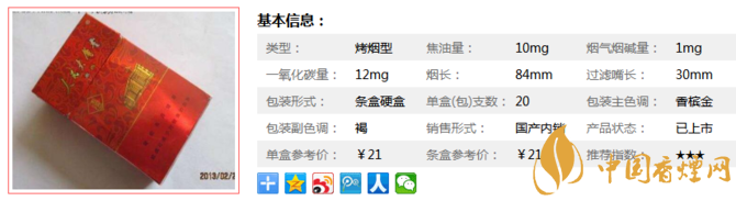 | 煙長:84mm | 過濾嘴長:30mm | 包裝形式:條盒硬盒 | 單盒(包)支數(shù):20 |