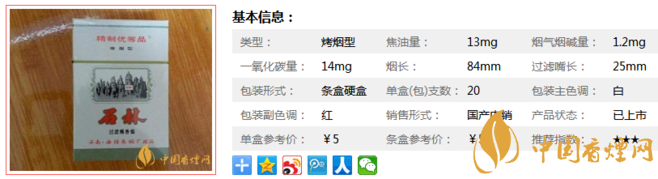 石林白香煙煙長(zhǎng)84mm,過濾嘴長(zhǎng)25mm,采用高難度的凸、平燙結(jié)合的燙金技術(shù);多工序膠凹印相結(jié)合,增加了商標(biāo)的制作難度;采用了具有較強(qiáng)防偽功能的潛影壓紋新技術(shù),從不同方向看,可見“石林”和“STONE FOREST”英文。下面我們一起來看石林白的參數(shù)信息:焦油量:13mg 煙堿量:1.2mg 一氧化碳量:14mg.