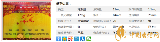 龍鳳呈祥硬珍品煙支長84mm,提質(zhì)改造后的龍鳳呈祥(喜慶珍品)香煙,全面應(yīng)用具有自主知識產(chǎn)權(quán)、獲四項國家發(fā)明專利的復(fù)合生化制劑綜合減害技術(shù),在保持中式卷煙特有香氣與醇厚吃味和諧的同時,能使煙氣中主要有害成分降低30%以上。下面我們一起來看龍鳳呈祥硬珍品的參數(shù)信息:焦油量:11mg. 煙堿量:1.1mg. 一氧化碳量:12mg.