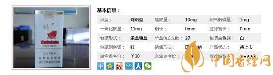 | 類型 :烤煙型 | 焦油量 :10mg | 煙氣煙堿量 :1mg | 一氧化碳量 :11mg |