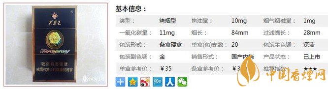 紅杉樹軟五星煙支長84mm,過濾嘴長28mm,首次采用CPF濾嘴和高透氣度卷煙紙,對卷煙焦油的截留能力明顯增強(qiáng),進(jìn)一步提高卷煙安全性。下面我們一起來看芙蓉王藍(lán)的參數(shù)信息:焦油量:10mg. 煙堿量:1mg. 一氧化碳量:11mg.