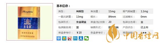 | 類(lèi)型 :烤煙型 | 焦油量 :11mg | 煙氣煙堿量 :1.1mg | 一氧化碳量 :13mg |
