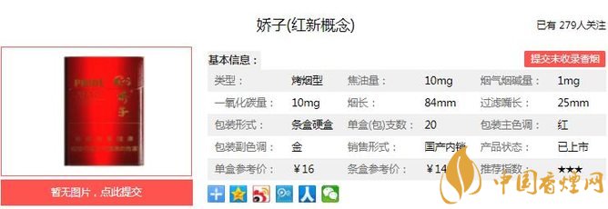 嬌子紅新概念煙支長84mm,過濾嘴長25mm,該產(chǎn)品在運用傳統(tǒng)的葉組配方降焦技術和卷煙紙降焦技術的基礎上,成功地集成應用了復合生化制劑減害材料這項具有川渝公司自主知識產(chǎn)權的核心減害技術。下面我們一起來看嬌子紅新概念的參數(shù)信息:焦油量:10mg 煙堿量:1.0mg 一氧化碳量:10mg