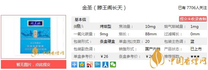 金圣(滕王閣長天)命名來源于《滕王閣序》:“落霞與孤鶩齊飛,秋水共長天一色”。目前我所知道的滕王閣系列,大概有10種。其中,粗支規(guī)格(煙支長度84mm及以下)7種、細支規(guī)格2種,中支規(guī)格1種。文中的長天,就屬于中支規(guī)格。下面就由香煙網(wǎng)小編帶大家一起來了解金圣(滕王閣長天)的相關信息。