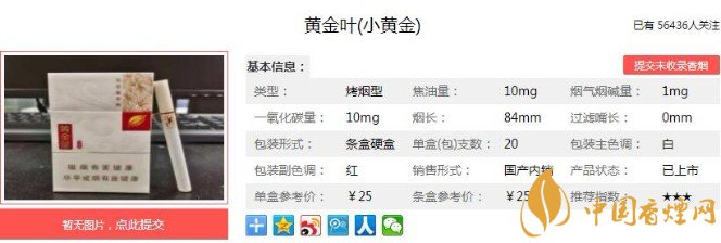 小黃金的濾嘴比較軟,抽到下半段時濾棉有點往內(nèi)陷,尾段煙香氣息的協(xié)調(diào)性稍有下降,略有點紊亂之感,但煙氣的總體品質(zhì)仍是保持在一個與之前很相近的范圍內(nèi),煙氣量亦是未見明顯減少。下面便是黃金葉(小黃金)的基本參數(shù):焦油量:10mg 煙堿量:1.0mg 一氧化碳量:10mg.