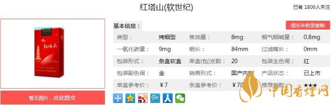 | 類型 :烤煙型 | 焦油量 :8mg | 煙氣煙堿量 :0.8mg | 一氧化碳量 :9mg |