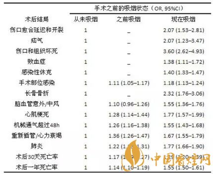 吸煙也是引起圍術(shù)期多數(shù)并發(fā)癥的重要因素。下表為相較于從未吸煙的患者,之前吸煙(即術(shù)前戒煙)和現(xiàn)在吸煙的患者發(fā)病的風(fēng)險:
