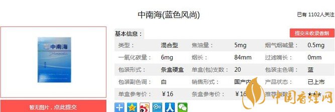 中南海藍色風尚聞味是非常淡雅,一點都不像混合型香煙的味道,只有吸食才知為混合類型的??诟芯d柔了,余味舒適,經(jīng)香煙網(wǎng)小編市場調(diào)查中南海藍色風尚售價為16元/包。