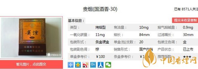 貴煙國酒香30品吸時(shí)將煙和酒兩種口感結(jié)合起來,給人一種全新的口感享受。讓業(yè)界側(cè)目的是,自貴煙(國酒香·30)率先上市后第一時(shí)間便取得了喜人銷量和良好口碑,產(chǎn)品供不應(yīng)求。經(jīng)香煙網(wǎng)小編市場調(diào)查貴煙國酒香30售價(jià)為100元/包。
