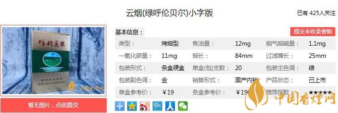 “呼倫貝爾”是烏蘭浩特卷煙廠生產(chǎn)的頂尖品牌,烏蘭浩特卷煙廠是紅云紅河集團(tuán)在省外生產(chǎn)卷煙的兩大卷煙生產(chǎn)廠之一。小字版云煙綠呼倫貝爾除了焦油含量比大字版本初期云煙綠呼高出1毫克之外,煙堿和一氧化碳的數(shù)值含量,兩代版本是相同的。經(jīng)香煙網(wǎng)小編市場(chǎng)調(diào)查云煙綠呼倫貝爾小字版售價(jià)為19元/包。