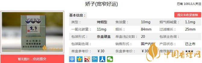嬌子寬窄好運(yùn)煙支長:84mm,過濾嘴長:34mm,采用超微植物顆粒復(fù)合濾棒,提升煙草焦甜本味,更增獨(dú)特復(fù)合香韻。下面我們一起來看嬌子寬窄好運(yùn)的參數(shù)信息:焦油量:10mg 煙堿量:1.1mg 一氧化碳量:11mg
