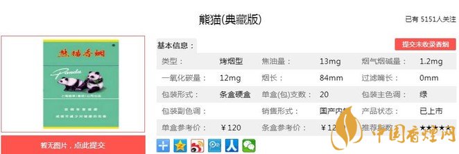 熊貓(典藏版)煙支長84mm,過濾嘴長30mm,金色“熊貓”、藍(lán)色“Panda”的字樣印在橫紋卷煙紙上,導(dǎo)致煙條段的視覺效果很短。煙絲為純?nèi)~絲,無填料,金黃油潤,柔軟整齊,品質(zhì)上乘。下面我們一起來看熊貓(典藏版)的參數(shù)信息:焦油量:13mg 煙堿量:1.2mg 一氧化碳量:12mg