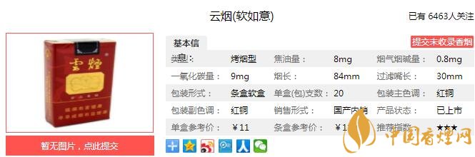 云煙軟如意產(chǎn)品類型:烤煙型、焦油量:8mg、煙堿量:0.8mg、一氧化碳量:9mg、包裝形式:條盒軟盒(每盒 20 支,每條 10 盒)、煙支規(guī)格:84mm。