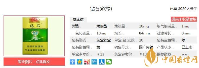 鉆石(軟綠)在繼承綠石2代風(fēng)格特點(diǎn)的基礎(chǔ)上,重點(diǎn)在煙香的醇和飽滿、口感的甜潤(rùn)舒適上進(jìn)行提升,進(jìn)一步突出了“醇甜香”的品類特征,葉組配方精選云南、巴西、津巴布韋優(yōu)質(zhì)烤煙,添加新型功能香料,采用特殊工藝處理,強(qiáng)化風(fēng)格特色。經(jīng)香煙網(wǎng)小編市場(chǎng)調(diào)查鉆石軟綠售價(jià)為13元/包。
