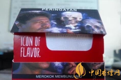 煙盒內(nèi)襯骨架上印制的“ICON OF FLAVOR”,直譯為‘風(fēng)味標(biāo)志",應(yīng)該指的是印尼硬紅萬那濃郁的混合氣味。錫紙上的Marlboro字體效果,有如浮雕般凸起。