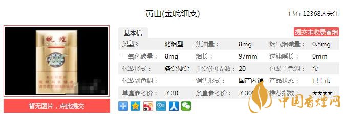黃山金皖細支精選皖南煙區(qū)上等“焦甜香”煙葉,深度醇化發(fā)酵,創(chuàng)新提香工藝,精心調(diào)配,認真打造每一支卷煙。外形亮麗、內(nèi)有乾坤,添加石斛爆珠,提供不一樣的消費體驗。經(jīng)香煙網(wǎng)小編市場調(diào)查黃山金皖細支售價為30元/包。