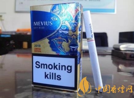 我們首先來看一看煙盒的整體包裝設(shè)計(jì)情況。柔七的LOGO自不必多言,它的下方印有“SKY BLUE”字樣,意指“天藍(lán)”或者“藍(lán)天”款式。歐盟樣式的黑色粗警示框的上方,同時(shí)印有“2018 LIMITED EDITON”字樣,意為“2018限量款”。