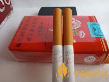 煙嘴顏色是黃色,上面隱約可以看到一些白色的小點(diǎn),煙支上面印有牡丹的圖案和logo。