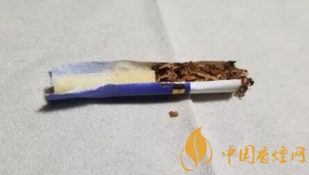 剖開濾嘴,絲束長度并不長,14mm左右。降焦孔正好在絲束的中部位置。水松紙內部還襯有一層類似綿紙的細軟質層。絲束的顏色比較淺,前段稍稍變黃一些。整段顏色均勻。