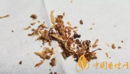 攤開煙絲,主要以明黃、棕黃的原片切絲為主,夾雜有切得極薄的煙梗。用料當屬用心和上選。
