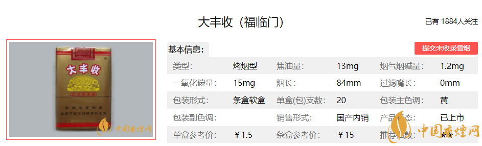 青“大豐收”為中國(guó)第一個(gè)卷煙共享品牌,是隸屬于中國(guó)煙草總公司的卷煙商標(biāo),制煙工藝經(jīng)典純正,致力于找尋卷煙最原始自然的口感,化繁為簡(jiǎn),不加香精香料,品出煙草本真的味道。下面便是大豐收(福臨門)的基本參數(shù):煙支長(zhǎng)度:84mm 焦油量:13mg 煙氣煙堿量:1.2mg 煙氣一氧化碳量:15mg.