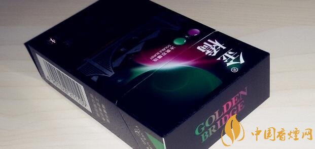 其余四個面采用了黑底碎花樣式的底紋,其中頂部的GOLDEN BRIDGE和底部的金橋字樣是從左至右的綠紅漸變色,而左面的盒標是8mg焦油、0.7mg煙堿和10mg一氧化碳,煙堿和一氧化碳的比例似不多見。#p#副標題#e#