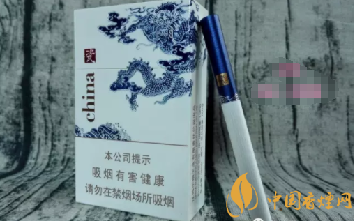 煙盒正面主圖為青花騰龍造型,張牙舞爪,欲入深海而攪起驚濤駭浪。煙盒頂端,印有青花瓷瓶的圖案,同時加以文字簡介。煙盒底端主色調(diào)為深藍,與正反兩面的藍色青花龍色調(diào)相輔相成。China和瓷的品名,再次印制于此部位。H103,是指產(chǎn)品的隨機編號。