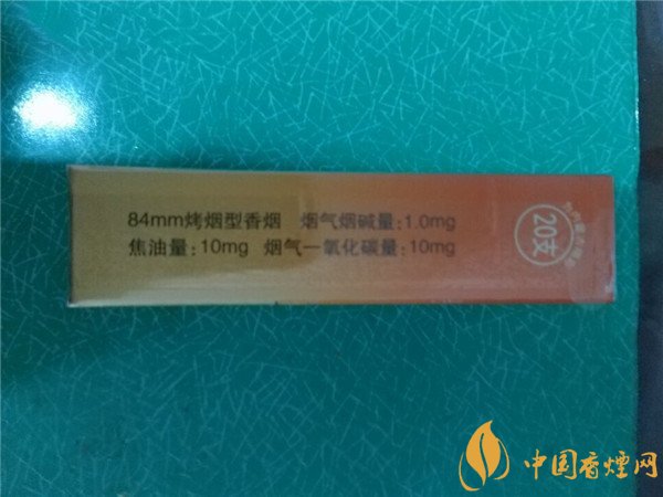 煙盒右側標注著香煙的理化數(shù)值,標注著過濾嘴香煙長84mm,1mg煙氣煙堿量,10mg焦油量,10mg煙氣一氧化碳量,印有主品牌單位名稱,數(shù)量指標。