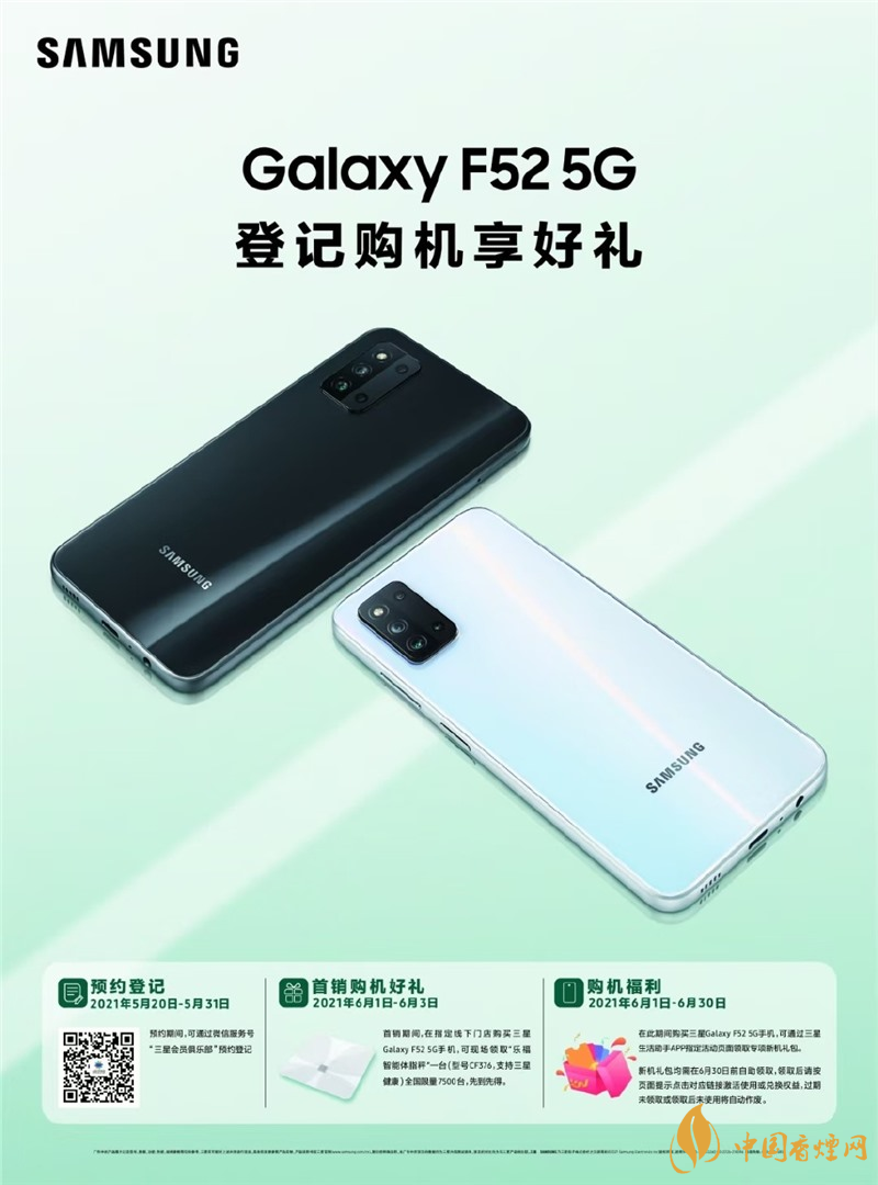 三星 Galaxy F52 5G 將于 5 月 20 日開啟國行預(yù)約,6 月 1 日正式開售,海報(bào)與真機(jī)圖已曝光。