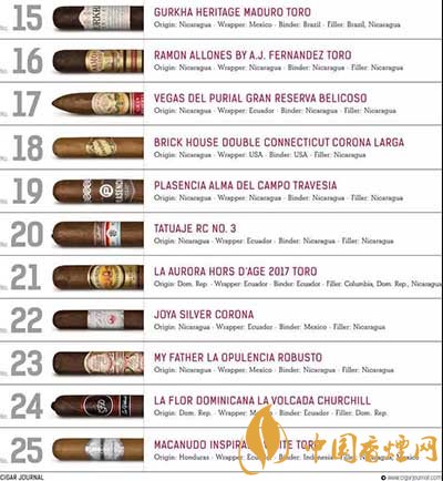 雪茄愛(ài)好者看過(guò)來(lái),2018年雪茄排行榜來(lái)了!2018年排名前十的雪茄有哪些呢?《cigarjournal》組織了品鑒小組評(píng)選出2018年前25名雪茄,品鑒小組由來(lái)自世界各地的70名雪茄愛(ài)好者和專(zhuān)家組成,涵蓋各個(gè)年齡層的女性和男性。下面就由香煙網(wǎng)小編帶大家一起來(lái)了解一下2018年雪茄排行榜的相關(guān)信息。