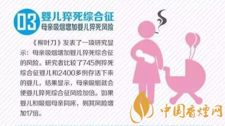 《柳葉刀》發(fā)表了一項研究顯示;母親吸煙增加嬰兒猝死綜合征的風(fēng)險。研究者比較了745例猝死綜合征嬰兒和2400多例存活下來的嬰兒,結(jié)果顯示,母親級煙就會使嬰兒猝死綜合征風(fēng)險加倍。如果嬰兒和吸煙母親同床,則其風(fēng)險增加17倍。