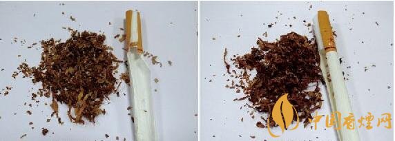 真品煙絲均是從醇化好的“紅花大金元”煙葉中手工甄選出千分之一,成為“云煙(軟大重九)”的主原料,從源頭到工藝的“四級(jí)調(diào)香”體系,形成了獨(dú)具特色的津甜香,切絲寬度均勻一致且無其他雜質(zhì);假煙從原料到煙絲結(jié)構(gòu)均無法達(dá)到真品煙絲成色及摻配比例,假煙煙絲雜質(zhì)較多,與真品煙絲結(jié)構(gòu)存在明顯差異。(左真右假)