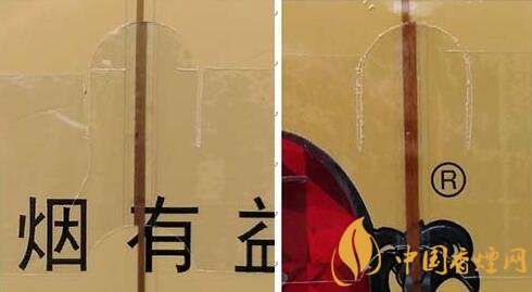 1.商標字體印刷。真品卷煙商標印刷采用“凹印”,兩種顏色交界邊緣呈現虛邊或鋸齒狀。假冒卷煙商標印刷一般采用“膠印”,兩種顏色交界邊緣比較清晰、光滑,無鋸齒狀。(圖1左真右假)
