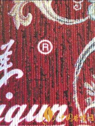 看正面注冊商標(biāo):真煙小盒正面注冊商標(biāo)圖案清晰明亮,外圍輪廓柔和,為完整的圓形,無鋸齒、無斷裂;假煙小盒正面注冊商標(biāo)圖案較為暗淡,外圍輪廓模糊,與背景圖案交疊錯印。