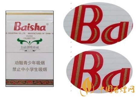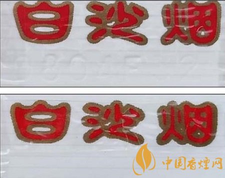 真品卷煙:背面Baisha拼音字母凹印,紅色與白色交界位置呈現(xiàn)模糊不清晰的鋸齒痕跡。(上真下假)