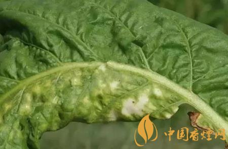 癥狀:幼嫩葉片發(fā)?。翰∪~直立;較大葉片發(fā)病:初期形成黃色圓斑,后病斑中間下陷,背面產(chǎn)生灰色或藍(lán)色霉層,嚴(yán)重時(shí)病斑融合成褐色壞死大斑,病葉皺縮扭曲。常表現(xiàn)系統(tǒng)感染,煙株矮化凋萎。在花、蒴果上也出現(xiàn)病斑。