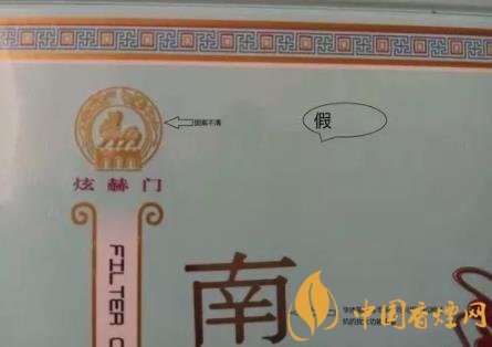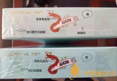 看條盒顏色,真煙為淡藍(lán)色,顏色柔和純正;假煙為淺藍(lán)色,視覺上顏色不是自然色??礂l盒圖標(biāo),真煙“南京”二字字體端正清晰,龍須印刷圖案無重疊,龍身金線為凸版,條盒金邊無毛刺;假煙“南京”二字字體向左微傾,龍須有疊痕錯(cuò)層,龍身顏色為褐紅色、金線為凹版,條盒金邊有毛刺。