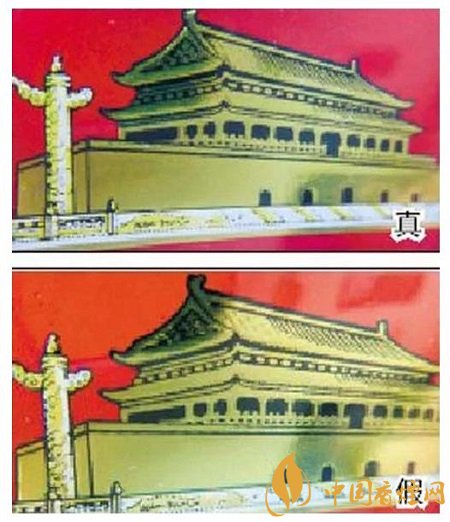 真煙天安門左側(cè)華表套色均勻,黃白色分布有明顯分界點(diǎn),邊緣光滑、干凈、清晰;假煙套色較差,黃白色不明顯,黃色部分印刷較分散,字體邊緣套印有毛渣點(diǎn),呈現(xiàn)鋸齒狀。